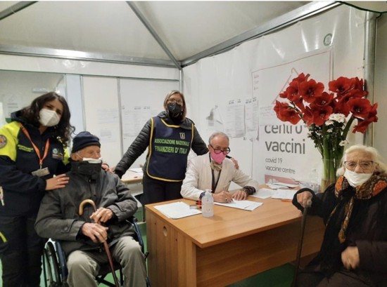 Coniugi di 103 e 100 anni si sono sottoposti, insieme, alla terza dose di vaccino. Si chiamano Marco (103 anni) e Pasqua (100 anni). Sono di Bitonto. Nella foto i due coniugi nell’hub di Bitonto.
