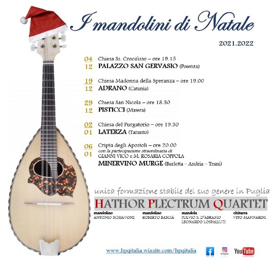 È partito da Palazzo San Gervasio il tour natalizio 2021-22 dell’HPQ, ensemble dedita alla riscoperta degli strumenti a plettro. Con il manduriano Roberto Bascià al mandolino (Antonio Schiavone, mandolino; Fulvio S. D’Abramo e Leonardo Lospalluti, mandòla e Vito Mannarini alla chitarra), il quartetto più longevo di Puglia (unico nel suo genere) riparte per sottolineare con il tremolo ed il pizzico dei propri strumenti le festività natalizie.