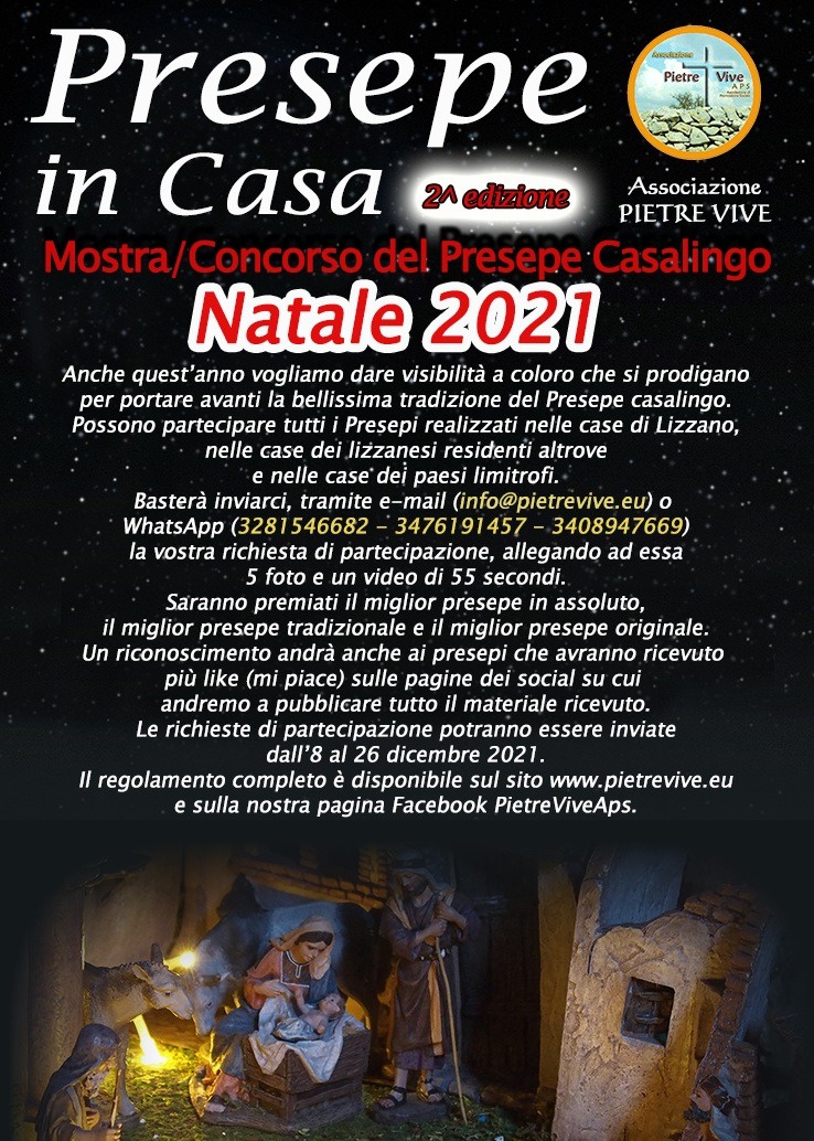 Dopo il successo ottenuto lo scorso anno, l’associazione Pietre Vive di Lizzano ripropone la 2ª edizione della mostra/concorso del presepe casalingo “Presepe in casa”.