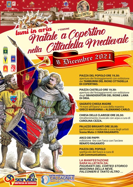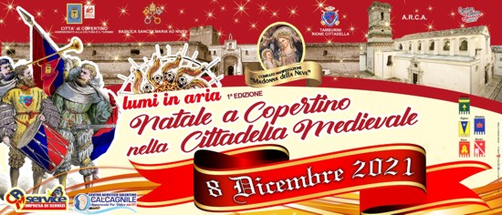 Stasera, a partire dalle 19.30, il tradizionale corteo storico “Madonna della Neve” - quello che anima l’estate di Copertino - a farsi cittadella medievale. Appuntamento questa sera nel borgo antico della città - tra piazza del Popolo, piazza Castello e via Margherita di Savoia - con la prima edizione di un’iniziativa a tema che tra spettacoli del fuoco, sbandieratori, musici, danzatrici, falconieri, arcieri - e nel rispetto delle limitazioni anti Covid - vedrà l’attore di origini copertinesi Walter Nestola, tra i protagonisti della serie tv “L’onore e il rispetto” e del film “Sulla mia pelle”, impersonare Manfredi, figlio dell’imperatore Federico II e Conte di Copertino.