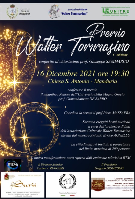 Istituita a Manduria una nuova onorificenza: si tratta del Premio Walter Tommasino, proposto, per la prima volta in questo 2021, dall’associazione culturale “Walter Tommasino”.