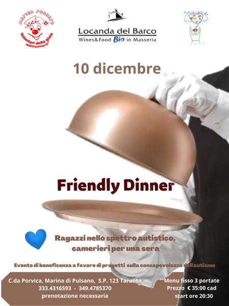 La “Friedly Dinner”, un evento di beneficenza a favore di progetti sulla consapevolezza dell’autismo, si terrà, con inizio alle ore 20.30, venerdì 10 dicembre presso il ristorante “Locanda del Barco”, in contrada “Porvica”, Marina di Pulsano S.P.123 Taranto.