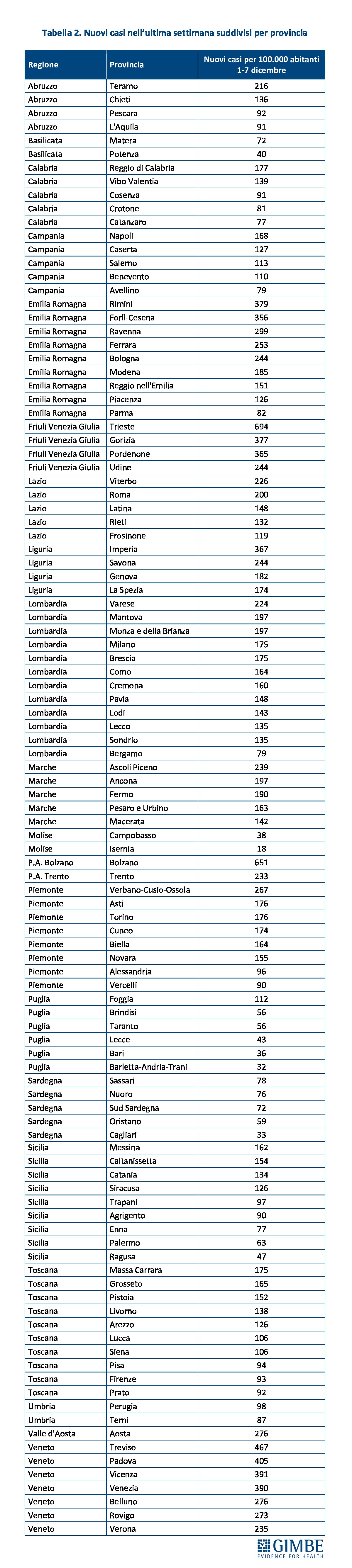 In 52 province l’incidenza è pari o superiore a 150 casi per 100.000 abitanti: Trieste (694), Bolzano (651), Treviso (467), Padova (405), Vicenza (391), Venezia (390), Rimini (379), Gorizia (377), Imperia (367), Pordenone (365), Forlì-Cesena (356), Ravenna (299), Aosta (276), Belluno (276), Rovigo (273), Verbano-Cusio-Ossola (267), Ferrara (253), Savona (244), Bologna (244), Udine (244), Ascoli Piceno (239), Verona (235), Trento (233), Viterbo (226), Varese (224), Teramo (216), Roma (200), Ancona (197), Mantova (197), Monza e Brianza (197), Fermo (190), Modena (185), Genova (182), Reggio di Calabria (177), Asti (176), Torino (176), Milano (175), Massa Carrara (175), Brescia 175), La Spezia (174), Cuneo (174), Napoli (168), Grosseto (165), Como (164), Biella (164), Pesaro e Urbino 163), Messina (162), Cremona (160), Novara (155), Caltanissetta (154), Pistoia (152), e Reggio nell’Emilia (151).