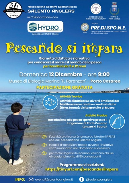 Nella giornata di domenica prossima, con il patrocinio del Comune di Porto Cesareo, l’associazione sportiva dilettantistica “Salento Anglers”, il Museo di Biologia Marena “Pietro Parenzan”, in collaborazione con l’associazione Hydro Otranto e sulla base di un progetto della Federazione Italiana Pesca Sportiva e Attività Subacquee, si svolgerà una giornata didattica e ricreativa per conoscere il mare e il mondo della pesca. L’attività sarà rivolta questa volta a giovani bambini dai cinque ai dodici anni e sarà suddivisa in due parti, una parte teorica incentrata sulle comunità caratteristiche dei diversi tipi di fondale, con particolare attenzione nel presentare ambienti familiari ai bambini, che possono essere da loro raggiunti ed esplorati durante un semplice bagno al mare, vi sarà anche una parte pratica di introduzione alla pesca sportiva presso il lungomare Raffaele Sambati di Porto Cesareo.