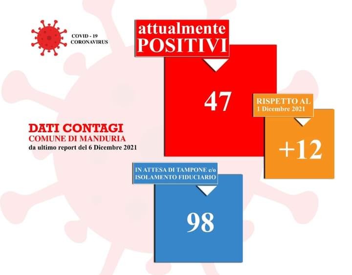Inizia a diventare preoccupante il quadro dei contagi da Covid a Manduria. Al 6 dicembre, i positivi erano 47, ovvero 13 in più rispetto al 30 novembre.