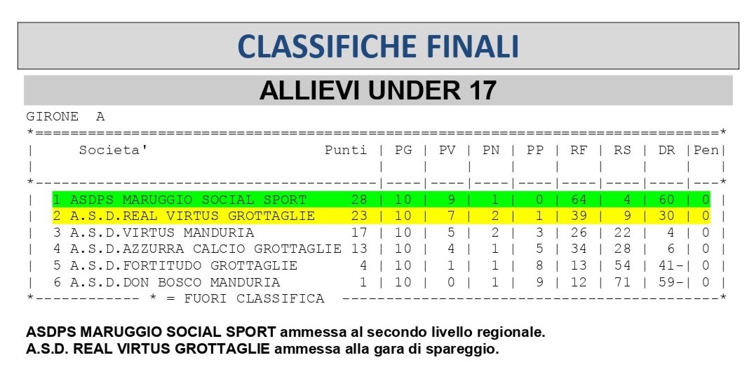 Terminato anche il torneo provinciale Allievi. Nel girone A dominio quasi incontrastato del Maruggio Social Sport, che ha concluso la stagione con 28 punti, frutto di 9 successi e un pareggio. Il predominio della squadra maruggese testimoniato anche dal miglior attacco (64 gol, oltre 6 di media a partita) e dalla migliore difesa (appena 4 gol al passivo). Il Maruggio Social Sport è dunque ammesso al secondo livello regionale.