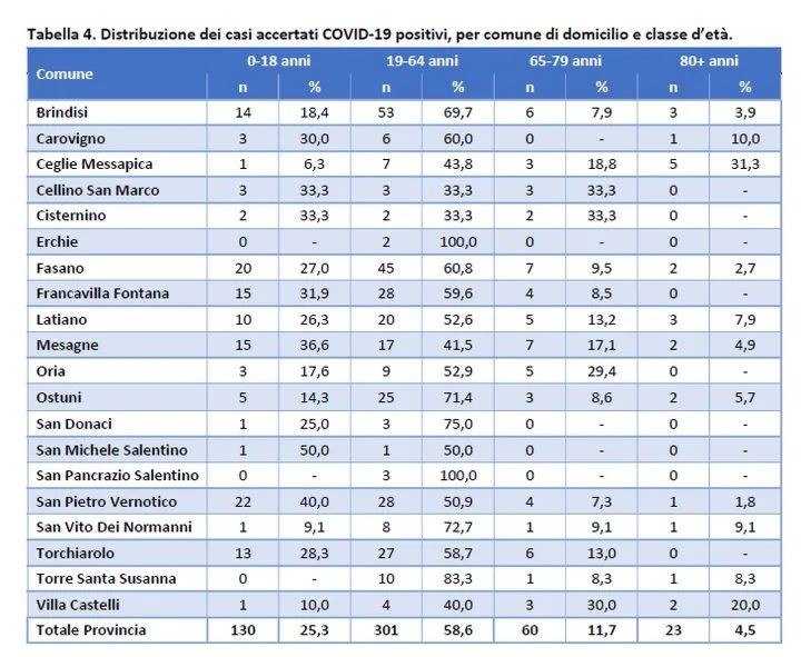 Per quanto riguarda la distribuzione per Comune i positivi sono 76 a Brindisi, 74 a Fasano, 55 a San Pietro Vernotico, 47 a Francavilla Fontana, 46 a Torchiarolo, 41 a Mesagne, 38 a Latiano, 35 a Ostuni, 17 a Oria, 16 a Ceglie Messapica, 12 a Torre Santa Susanna, 11 a San Vito dei Normanni, 10 a Carovigno, 10 a Villa Castelli, 9 a Cellino San Marco, 6 a Cisternino, 4 a San Donaci, 3 a San Pancrazio Salentino, 2 a Erchie, 2 a San Michele Salentino.