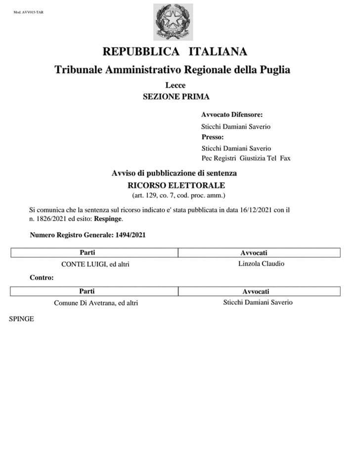 Dopo le elezioni amministrative, vinte dal Sindaco Antonio Iazzi e la lista R-innoviamo Avetrana, Luigi Conte e soci hanno deciso di presentare ricorso mettendo in dubbio la buona fede ed onestà dei presidenti di seggio, scrutatori e di tutta la macchina elettorale del Comune di Avetrana. Il TAR ha respinto le loro accuse.