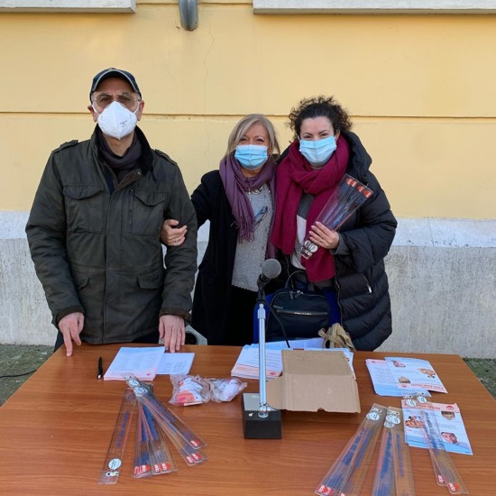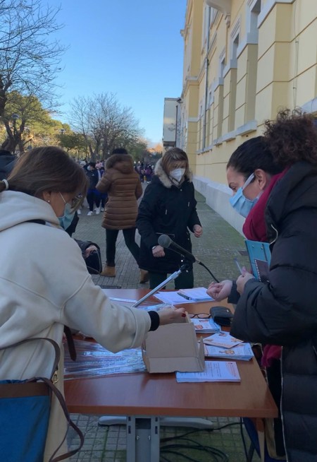 Il tavolo informativo è stato allestito davanti all’ingresso della scuola e ciò ha consentito di parlare alle famiglie e agli studenti in attesa del suono della campanella.