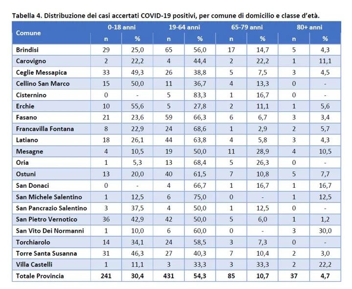 Per quanto riguarda la distribuzione per Comune i positivi sono 116 a Brindisi, 89 a Fasano, 84 a San Pietro Vernotico, 69 a Latiano, 67 a Ceglie Messapica, 67 a Torre Santa Susanna, 65 a Ostuni, 41 a Torchiarolo, 38 a Mesagne, 35 a Francavilla Fontana, 30 a Cellino San Marco, 19 a Oria, 18 a Erchie, 10 a San Vito dei Normanni, 9 a Carovigno, 9 a Villa Castelli, 8 a San Michele Salentino, 8 a San Pancrazio Salentino, 6 a Cisternino, 6 a San Donaci.