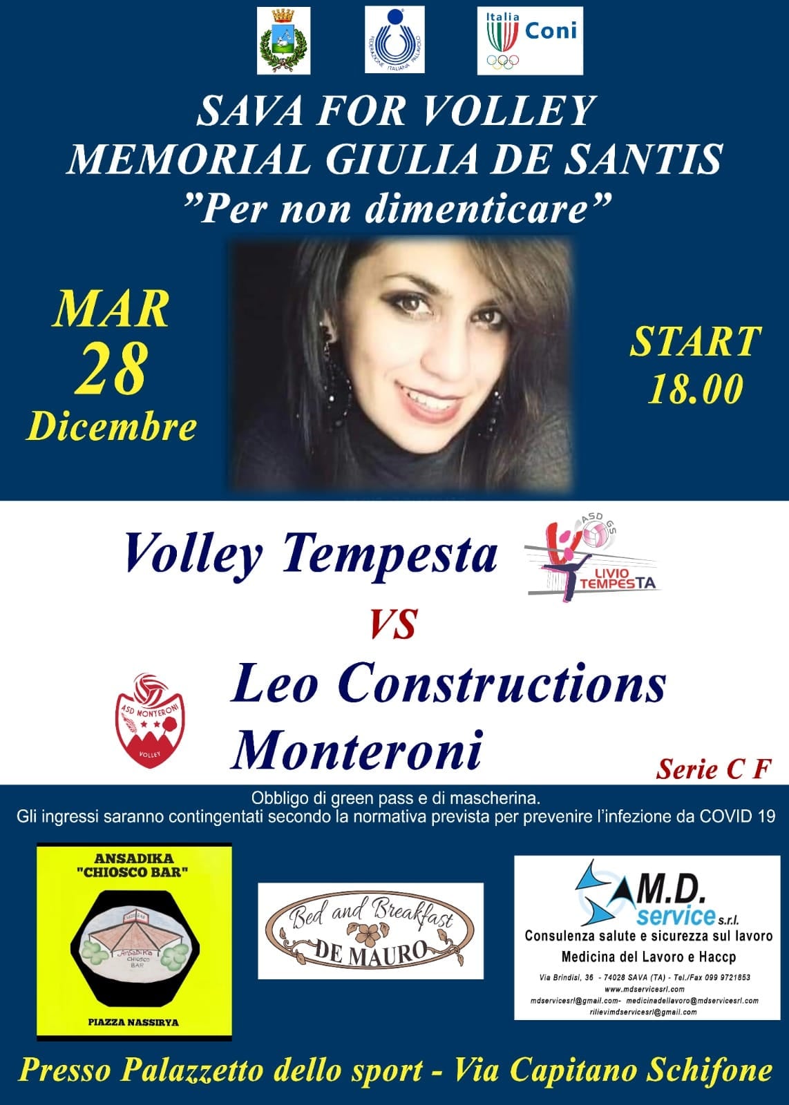 Fra le iniziative promosse dal comitato, martedì 28 dicembre, presso il palasport di Sava, avrà luogo il primo “Memorial Giulia De Santis” organizzato dalla società Sava for Volley, per non dimenticare. Alle 18, si affronteranno il Volley Tempesta Taranto e la Leo Constructions Monteroni.