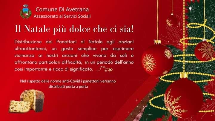 L’Amministrazione comunale di Avetrana, con l’assessore ai Servizi Sociali, presentano “Il Natale più dolce che ci sia”, evento che prevede la distribuzione di panettoni agli anziani ultraottantenni. Un gesto semplice, un omaggio, un dono fatto con il cuore, per esprimere vicinanza agli anziani che vivono da soli o affrontano particolari difficoltà, in un periodo dell’anno così importante e ricco di significato.