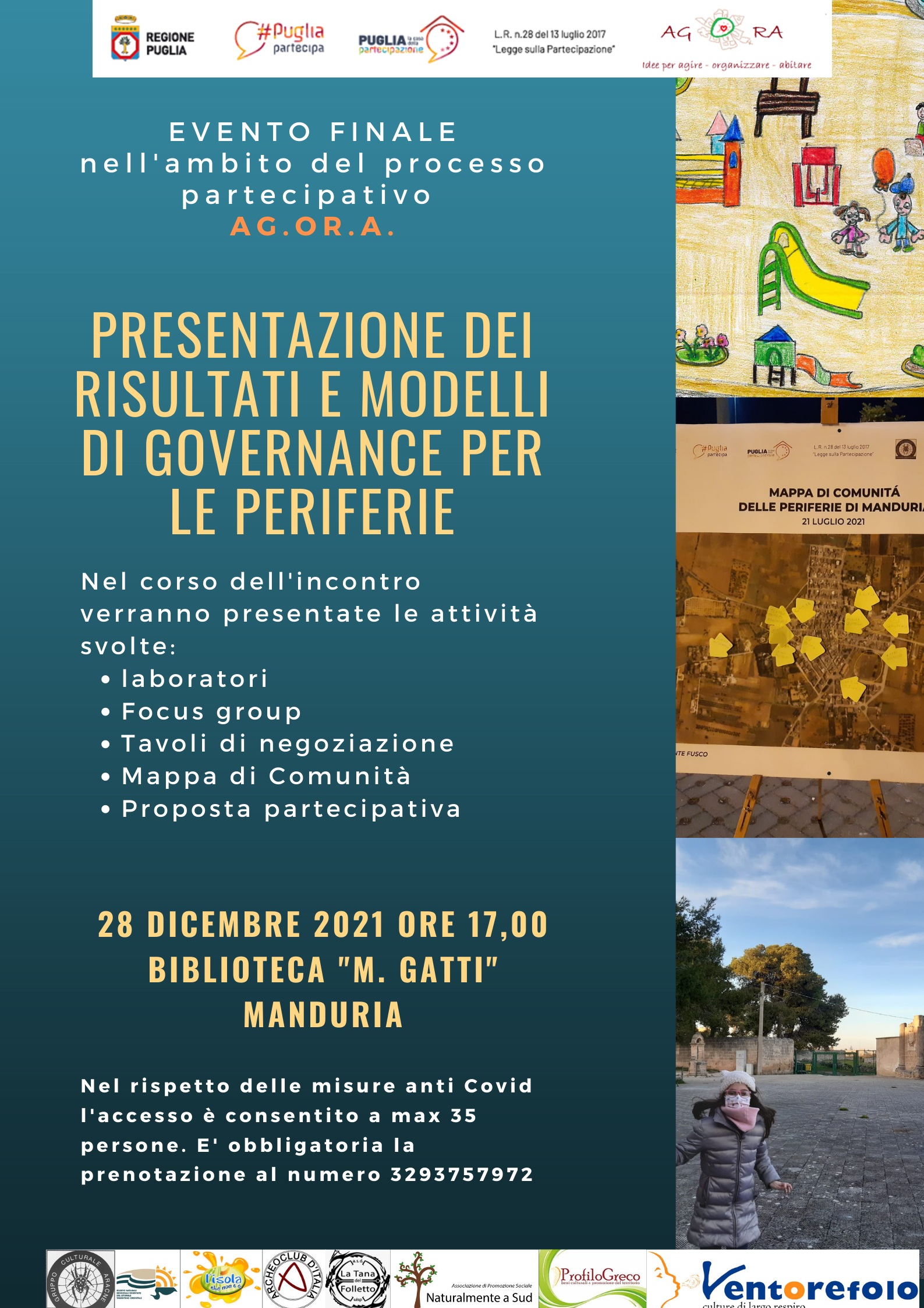 Il progetto AG.OR.A. – Idee per Agire – Organizzare – Abitare,vincitore del bando PugliaPartecipa, finanziato dalla Regione in attuazione della Legge sulla Partecipazione, è giunto al termine. Martedì 28 dicembre, alle ore 17, presso la biblioteca “Marco Gatti di Manduria”, verranno restituiti alla comunità i risultati raggiunti.