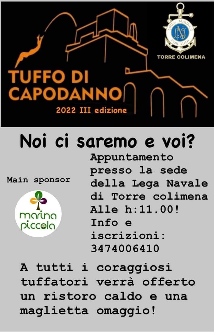 E’ giunta alla terza edizione l’iniziativa “Il tuffo di Capodanno”, promossa dalla sezione di Torre Colimena della Lega Navale. Per chi volesse sfidare la temperatura non certamente favorevole per un tuffo nelle acque di Torre Colimena, l’appuntamento è per le ore 11 di Capodanno. A tutti i coraggiosi tuffatori verrà offerto un ristoro caldo e regalata una maglietta.