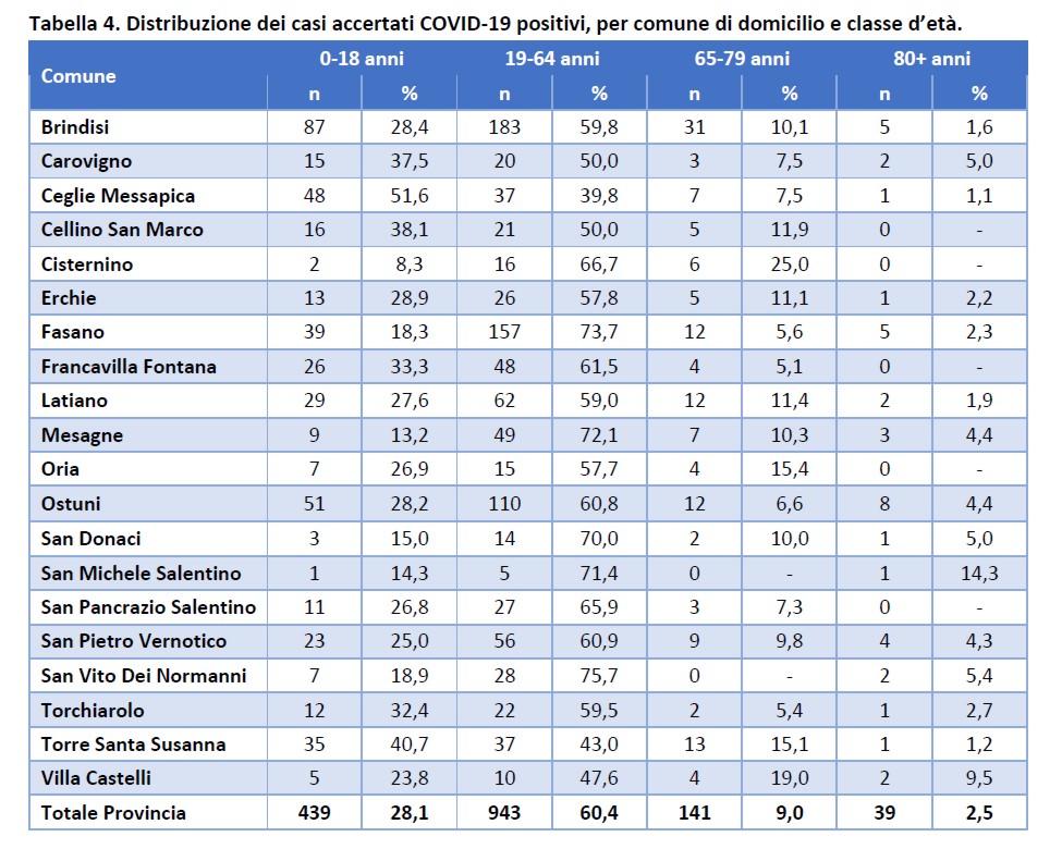 Per quanto riguarda la distribuzione per Comune i positivi sono 306 a Brindisi, 213 a Fasano, 181 a Ostuni, 105 a Latiano, 93 a Ceglie Messapica, 92 a San Pietro Vernotico, 86 a Torre Santa Susanna, 78 a Francavilla Fontana, 68 a Mesagne, 45 a Erchie, 42 a Cellino San Marco, 41 a San Pancrazio Salentino, 40 a Carovigno, 37 a San Vito dei Normanni, 37 a Torchiarolo, 26 a Oria, 24 a Cisternino, 21 a Villa Castelli, 20 a San Donaci, 7 a San Michele Salentino.
