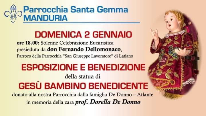 Sarà esposta e benedetta domenica 2 gennaio, nel corso della funzione religiosa delle 18, presieduta da don Fernando Dellomonaco (parroco della parrocchia di San Giuseppe Lavoratore di Latiano), la statua di Gesù Bambino Benedicente donata alla parrocchia di Santa Gemma Galgani dalla famiglia De Donno-Atlante in memoria della prof.ssa Dorella De Donno.