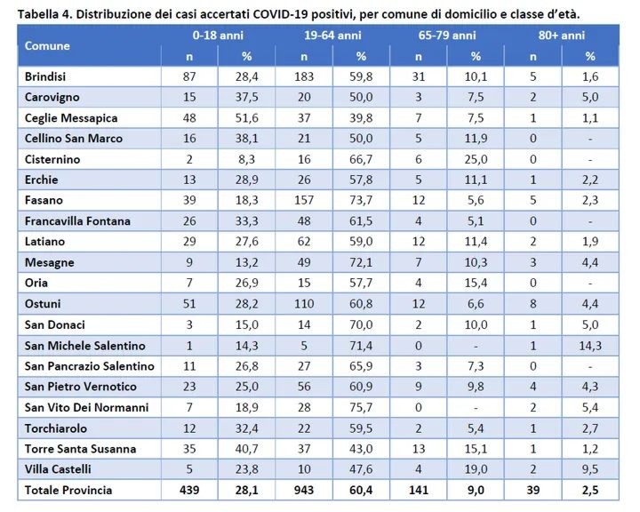 Per quanto riguarda la distribuzione per Comune i positivi sono 306 a Brindisi, 213 a Fasano, 181 a Ostuni, 105 a Latiano, 93 a Ceglie Messapica, 92 a San Pietro Vernotico, 86 a Torre Santa Susanna, 78 a Francavilla Fontana, 68 a Mesagne, 45 a Erchie, 42 a Cellino San Marco, 41 a San Pancrazio Salentino, 40 a Carovigno, 37 a San Vito dei Normanni, 37 a Torchiarolo, 26 a Oria, 24 a Cisternino, 21 a Villa Castelli, 20 a San Donaci, 7 a San Michele Salentino.