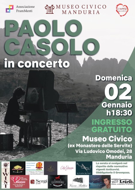 Domenica 2 gennaio, a partire dalle ore 18,30, il museo civico di Manduria (via Omodei n. 28, primo piano del palazzo delle Servite) ospita “Paolo Casolo in concerto”. Evento innovativo nelle premesse e nell’esibizione: primo concerto dell’anno 2022, gratuito e che si svolgerà per la prima volta in assoluto nella sala del museo della II Guerra Mondiale, dove le teche e i cimeli