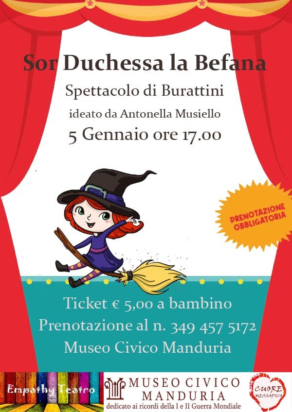 La Befana sarà la prima attrice dello spettacolo di burattini “Sor Duchessa la Befana” ed è in ansia di prestazione, proprio non ce la fa, non sta proprio sulla “scopa” perché non vede l’ora di esibirsi sul palcoscenico del museo civico Manduria (via Omodei n. 28, primo piano del palazzo delle Servite) alle ore 17.