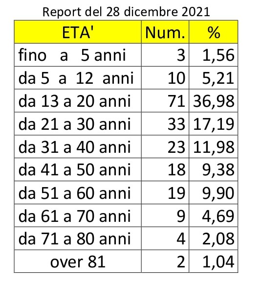 Da rimarcare come oltre la metà di questi casi sono ascritti ai componenti di due fasce di età: 13 e 20 anni (36,98%) e 21 e 30 anni (17,19%). Si tratta, insomma, per lo più di ragazzi, molti dei quali hanno preso parte ad una festa pre-natalizia.