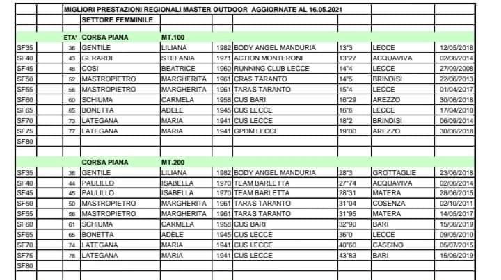 Appartengono all’atleta manduriana Liliana Gentile (Body Angel Manduria) ben quattro record pugliesi nel settore della velocità dell’atletica leggera, categoria SF 35.