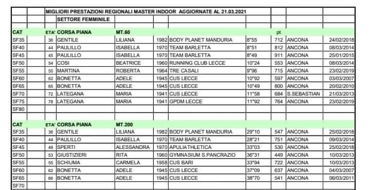 INDOOR – Sono stati stabiliti entrambi sulla pista di Ancona. I 60 metri sono stati percorsi in 7”10 (24 febbraio 2018). Il cronometro della gara dei 200 metri (25 febbraio 2018), si è fermato dopo 29”10. Nessuna altra donna in Puglia, in questa categoria, è stata in grado di fare meglio.
