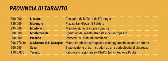 Nel dettaglio, in provincia di Taranto hanno ottenuto: 300 mila euro a Lizzano per il recupero della Torre dell’Orologio; 150 mila euro a Maruggio per lavori in Piazza San Giovanni Battista; al Comune di Montemesola 300 mila euro per il ripristino del manto stradale e del sottopasso; 300 mila euro a Pulsano per interventi sulla viabilità comunale. A questi, si aggiunge 1 milione di euro di investimento diretto della Regione Puglia per il miglioramento sismico del fabbricato regionale ex INAPLI, sede degli uffici regionali a Taranto.