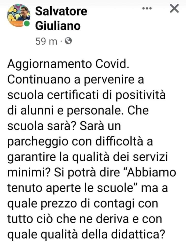 «Continuano a pervenire a scuola certificati di positività di alunni e personale. Che scuola sarà? Sarà un parcheggio con difficoltà a garantire la qualità dei servizi minimi? Si potrà dire “Abbiamo tenuto aperte le scuole” ma a quale prezzo di contagi con tutto ciò che ne deriva e con quale qualità della didattica?.