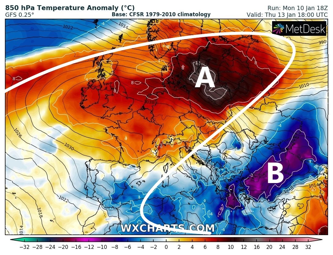 L'irruzione di aria fredda continuerà a far sentire i suoi effetti fino a mercoledì, grazie ad un robusto anticiclone che si andrà ad instaurare sul Regno Unito il quale nel fine settimana, con rotazione oraria, andrà garantendo un breve miglioramento delle condizioni meteo ovunque. Fino a giovedì, aria fredda in afflusso dall'est Europa, garantirà cieli parzialmente nuvolosi con schiarite. Pochi o nulli fenomeni. Ventilazione moderata, localmente forte solo nella giornata di oggi. Massime non oltre i 10/11°, in lieve rialzo nel weekend. Freddo o molto freddo di notte.