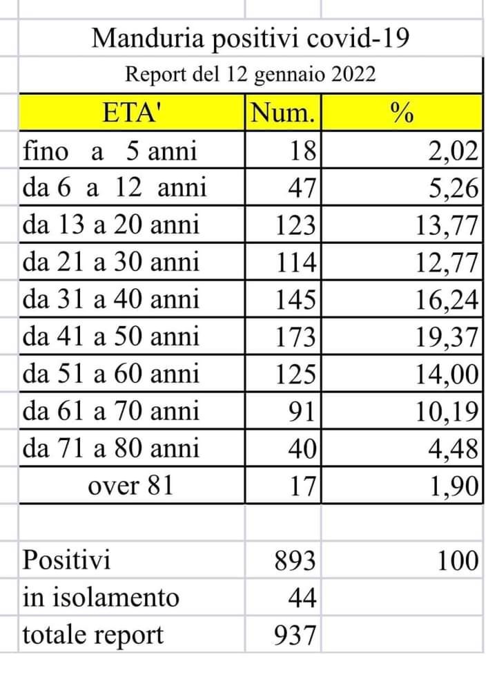 893 manduriani positivi alla data del 12 gennaio scorso. 18 in più, insomma, rispetto al giorno prima: questo il saldo fra nuovi contagi e manduriani negativizzati.