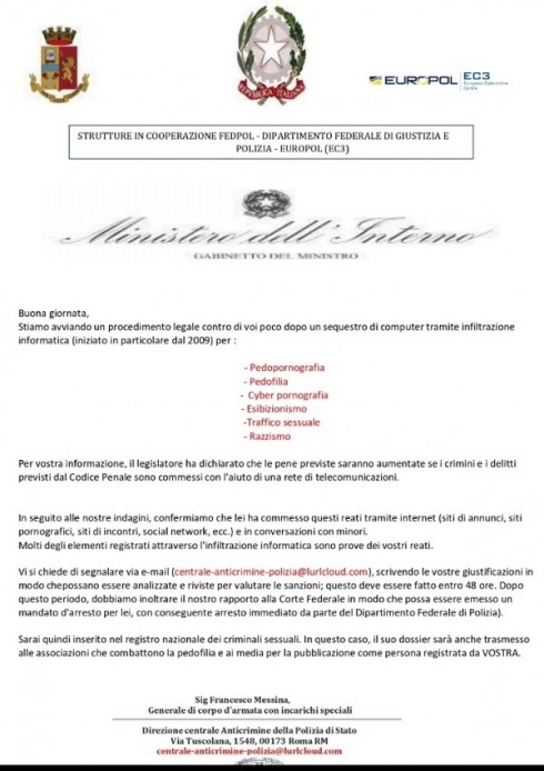 Tali falsi messaggi, scritti in diverse lingue, utilizzano anche logo della Repubblica Italiana, del Ministero dell’Interno, di Europol o della Polizia, e prospettano alla vittima una inesistente indagine penale nei suoi confronti; il tutto allo scopo di causare agitazione nel destinatario, inducendolo a ricontattare i truffatori ed esponendosi in tal modo a successive richieste di pagamenti in denaro o comunicazione di propri dati personali.
