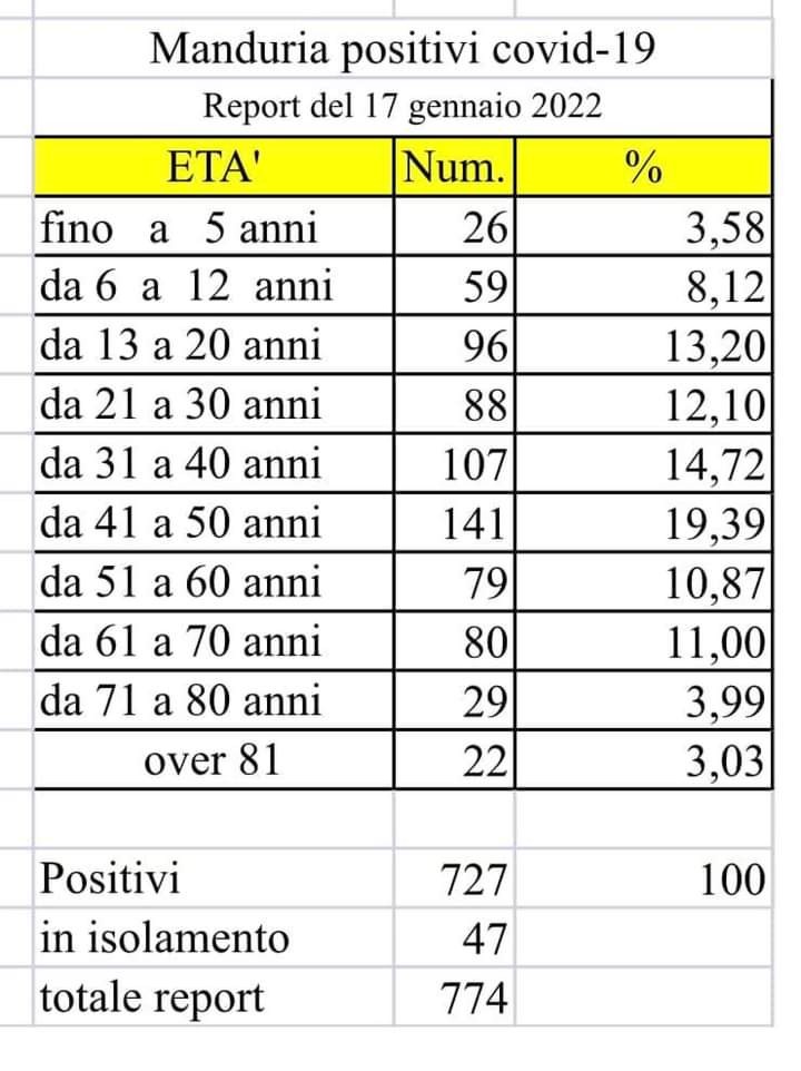 Continua a scendere il numero degli attualmente positivi al Covid a Manduria: si è passati da 806 positivi (15 gennaio) a 727 positivi (17 gennaio).