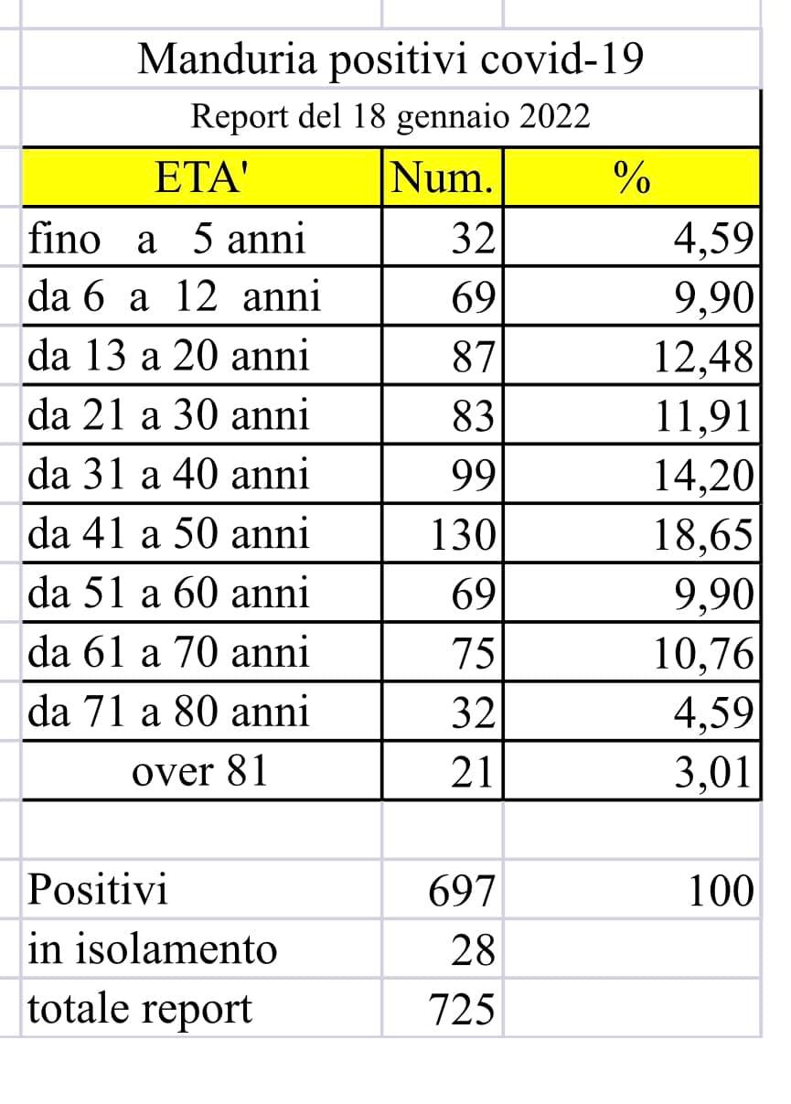 In isolamento, al 18 gennaio, vi erano 28 manduriani. Il 17 gennaio erano 47.