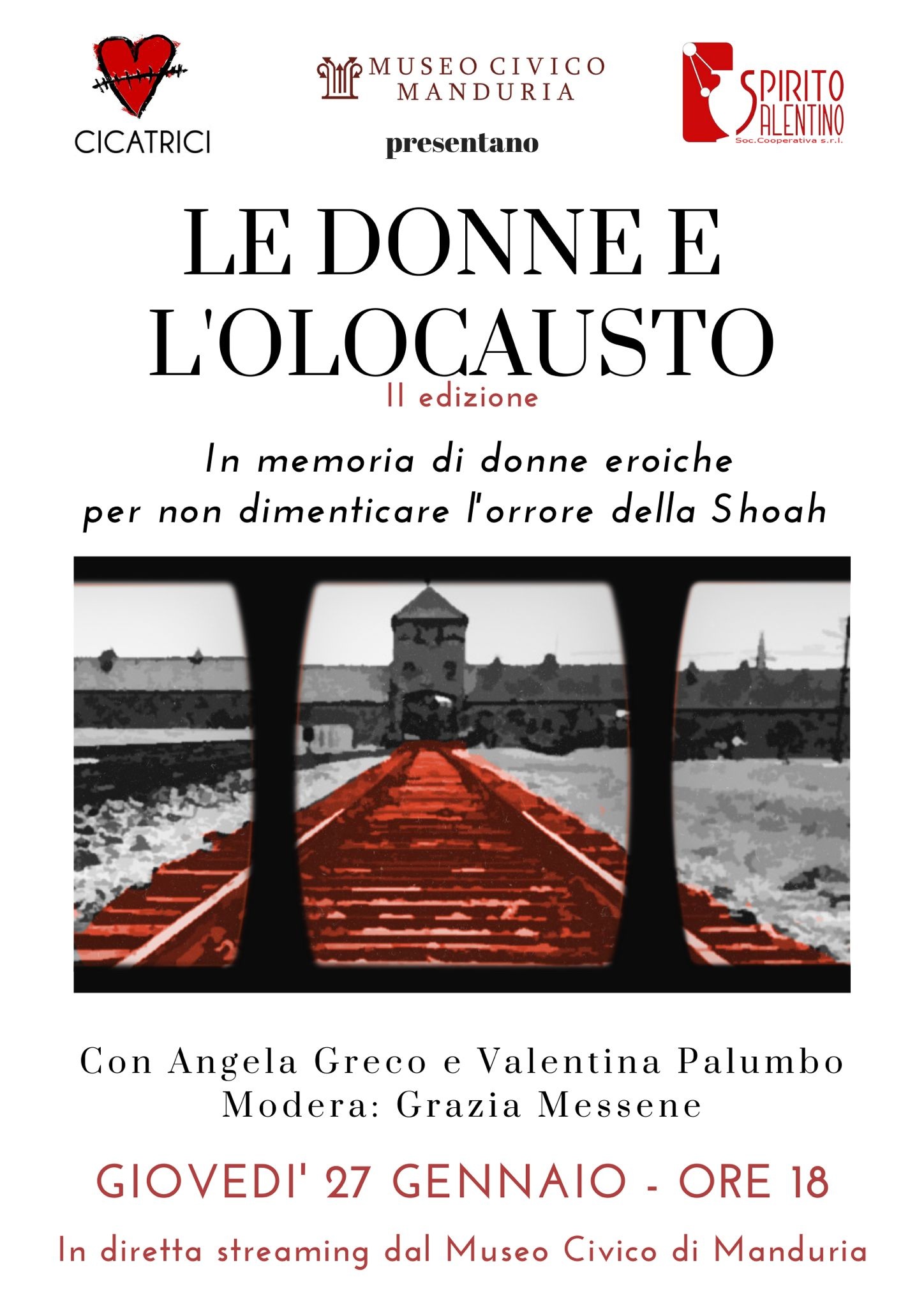 Nonostante tutte le difficoltà legate alla quarta ondata della pandemia da Covid-19, l’associazione “Cicatrici”, assieme alla cooperativa “Spirito Salentino”, grazie alla consueta disponibilità del museo civico di Manduria, giovedì 27 gennaio, a partire dalle ore 18, daranno vita ad un intenso momento di riflessione, intitolato “Le donne e l’Olocausto” e che sarà trasmesso in diretta streaming sulle pagine Facebook di Cicatrici, Spirito Salentino e del museo civico di Manduria.