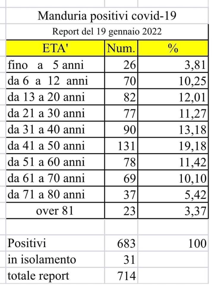 L’ultimo report, comunque datato (risale al 19 gennaio), riferisce di 683 manduriani positivi e 31 in isolamento fiduciario
