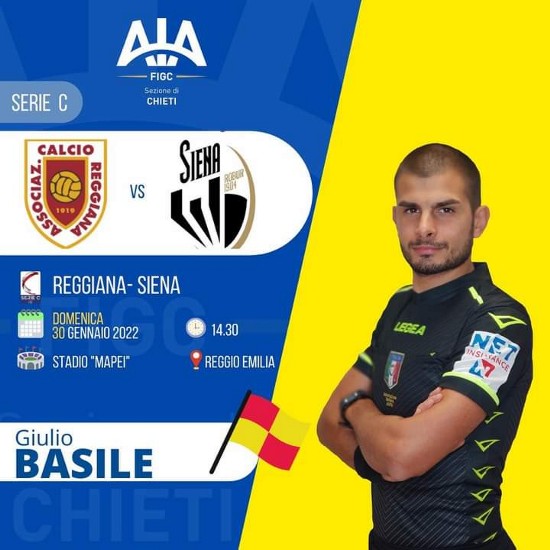 Giulio Basile, tesserato per la sezione AIA di Chieti, è stato designato come primo assistente per la partita di serie C fra Reggiana e Siena di domenica. Si disputerà, alle 14,30, al “Mapaei Stadium” di Reggio Emilia.