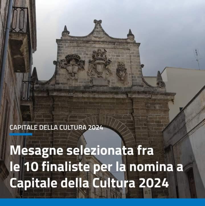 Il Ministero della Cultura ha reso note le 10 finaliste per l’edizione del 2024 della capitale italiana della cultura. Tra queste figura Mesagne, unica pugliese. Le città selezionate verranno audite, in video-conferenza, i prossimo 3 e 4 marzo da parte della giuria che dovrà poi indicare al ministro Dario Franceschini la candidatura ritenuta più idonea. Assieme a Mesagne, si contendono il titolo Ascoli Piceno, Chioggia, Grosseto, Pesaro, Sestri Levante con il Tigullio, Siracusa, Unione dei Comuni Paestum-Alto Cilento, Viareggio e Vicenza.