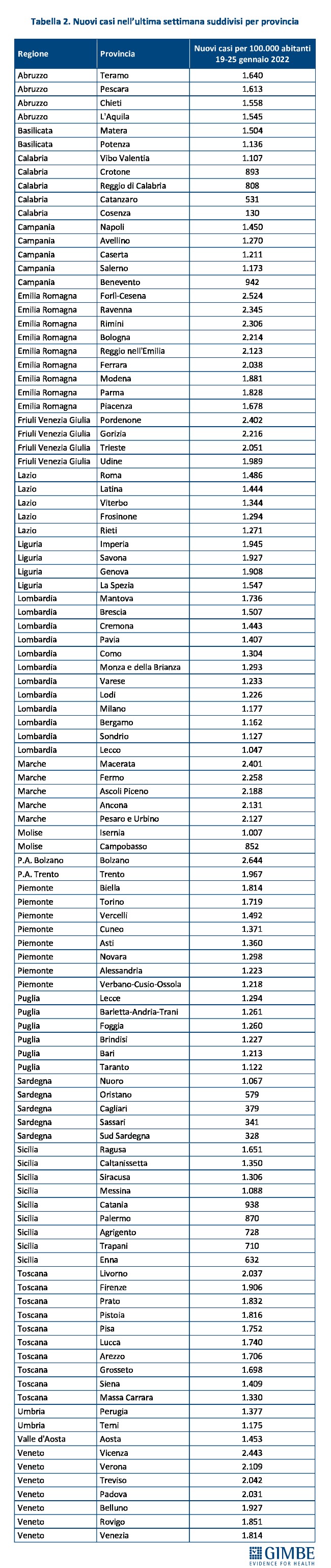 Scendono intanto da 51 a 20 le province con incidenza superiore ai 2.000 casi per 100.000 abitanti: Bolzano (2.644), Forlì-Cesena (2.524), Vicenza (2.443), Pordenone (2.402), Macerata (2.401), Ravenna (2.345), Rimini (2.306), Fermo (2.258), Gorizia (2.216), Bologna (2.214), Ascoli Piceno (2.188), Ancona (2.131), Pesaro e Urbino (2.127), Reggio nell'Emilia (2.123), Verona (2.109), Trieste (2.051), Treviso (2.042), Ferrara (2.038), Livorno (2.037) e Padova (2.031).