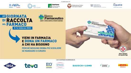 Anche quest’anno, si svolgerà la GRF - Giornata di Raccolta del Farmaco. Durerà una settimana, da martedì 8 a lunedì 14 febbraio. In 5.000 farmacie che aderiscono in tutta Italia (espongono la locandina dell’iniziativa e l’elenco è consultabile su www.bancofarmaceutico.org), sarà chiesto ai cittadini di donare uno o più medicinali da banco per i bisognosi. I farmaci raccolti (nel 2021, 465.019 confezioni, pari a un valore di 3.640.286 di euro) saranno consegnati a 1.800 realtà assistenziali che si prendono cura delle persone indigenti, offrendo gratuitamente cure e medicine. Si invitano i cittadini ad andare apposta in farmacia per donare un farmaco.