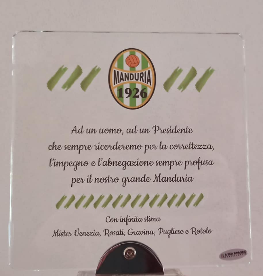 La vita ha riservato, purtroppo, al presidente Stranieri dei problemi di salute. Ma i suoi amici, quelli veri, sono rimasti sempre vicini a Vincenzo. E, proprio ieri, tre protagonisti di quella cavalcata (mister Venezia, Pugliese e Gravina) sono ritornati a Manduria per incontrare nuovamente Vincenzo Stranieri. A loro hanno donato una targa, che vi proponiamo nella foto in basso.