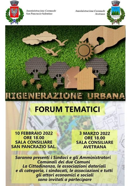 «Abbiamo programmato due incontri per svelarvi la “chiave” della progettazione congiunta e soprattutto per consentire a tutta la cittadinanza di Avetrana (e di San Pancrazio Salentino) di contribuire alla progettualità. L'obiettivo è ascoltare le idee di tutti e tradurle in progettualità utili alla crescita sociale ed economica del nostro territorio. Appuntamento giovedì 3 marzo prossimo presso la sala consiliare del nostro Comune. Auspicando una situazione pandemica favorevole».