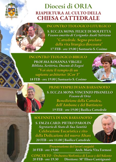 Il vescovo Vincenzo Pisanello annuncia che domenica 20 febbraio - festa del Patrocinio di San Barsanofio, patrono e protettore della città e della Diocesi di Oria - sua Eminenza il Cardinale Pietro Parolin, segretario di Stato di Sua Santità, presiederà alle ore 11 la Santa Messa per la riapertura e l'inaugurazione della Basilica Cattedrale con la consacrazione del nuovo altare, al termine dei lavori di adeguamento liturgico e risanamento conservativo dell'edificio sacro.
