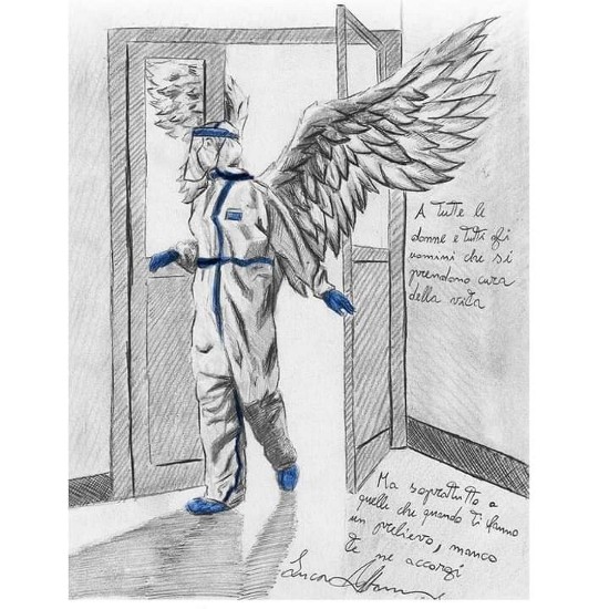 Nel disegno di Luca Albanese raffigurata un’operatrice sanitaria come un angelo
