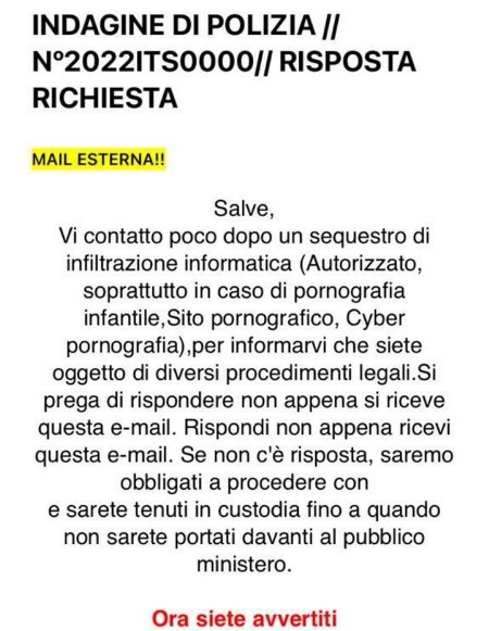 Il falso messaggio intima al destinatario di rispondere alla mail per avere informazioni in merito ad un’indagine di pedopornografia in cui lo stesso sarebbe coinvolto.