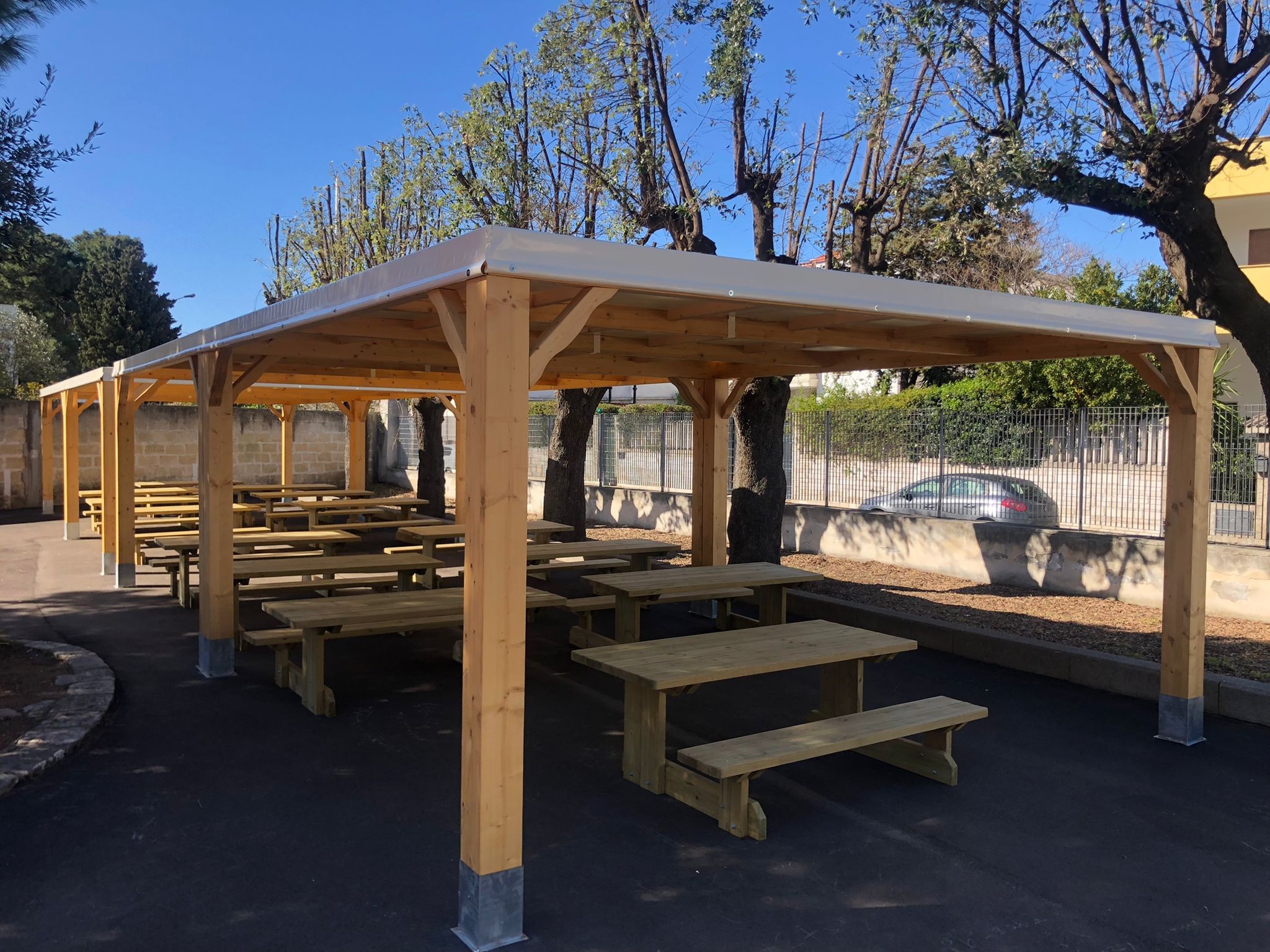 Si tratta, nello specifico, di ben quattro aule all’aperto, per complessivi 160 metri quadrati a disposizione, realizzate con delle strutture in legno lamellare con copertura ombreggiante e allestite con arredi scolastici in legno da esterno.