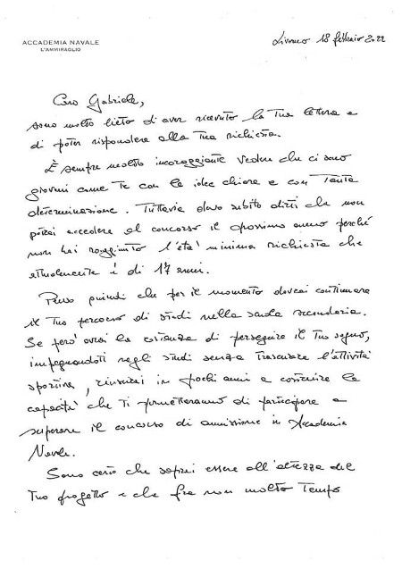 Questa il testo della sua lettera, inviata al Comandante dell’Accademia Navale di Livorno, che abbiamo riprodotto nella foto in alto.