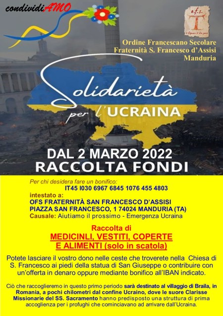 A seguito dei terribili eventi che in questi giorni hanno colpito la popolazione Ucraina, il Consiglio di fraternità dell’Ordine Francesco Secolare Fraternità “S. Francesco d’Assisi” in Manduria comunica che da oggi promuove una RACCOLTA FONDI per la popolazi0ne Ucraina.