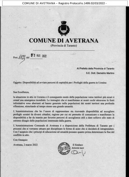 Il sindaco di Avetrana Antonio Iazzi ha comunicato al Prefetto di Taranto la disponibilità del Comune e di diversi cittadini ad avviare percorsi di ospitalità per i profughi della guerra in Ucraina.