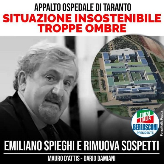 «Noi siamo garantisti, ma la situazione ormai è insostenibile: le ultime notizie diffuse dalla stampa sull’inchiesta della Procura che riguarda Elio Sannicandro e Claudio Stefanazzi, sul presunto appalto truccato per l’ospedale di Taranto, richiedono un segnale di Emiliano che possa ristabilire la serenità nelle istituzioni.