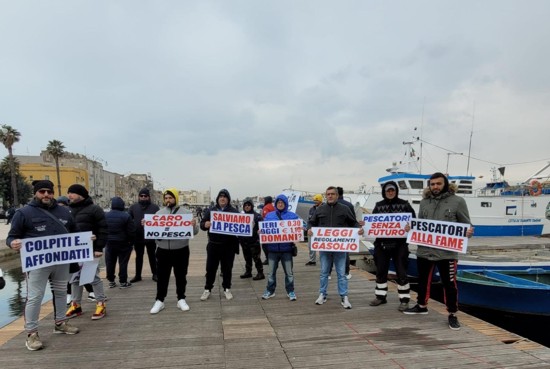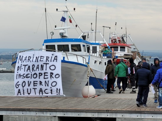 «Non riusciamo più a sostenere i costi. Un’uscita in mare è diventata insostenibile: vanno coperte le spese, in primis il prezzo del carburante arrivato alle stelle. Se il valore del pescato non supera i costi ovviamente andiamo sotto. Chiaro che questa, insieme a tutte le altre problematiche del comparto, diventa una montagna difficile da scalare. Ragion per cui sono moltissimi alla fine a cedere e ad abbandonare questa attività per cercare altro e condurre una vita dignitosa». Immediato il messaggio che i pescatori lanciano dalla banchina di via Cariati dove le barche sono ferme, e vi resteranno per il resto della settimana, come immediati ed incisivi sono i cartelli che gli operatori mostrano per rappresentare le criticità di questo particolare momento. “Marineria di Taranto in sciopero. Governo aiutaci” “Colpiti e affondati” “Pescatori alla fame” “Pescatori senza futuro” “Salviamo la pesca” “Caro gasolio: no pesca”: così la marineria tarantina, Agci Pesca e Legacoop Agroalimentare in testa, aderisce alle iniziative nazionali di protesta organizzate a livello nazionale dalle associazioni di categoria della pesca.
